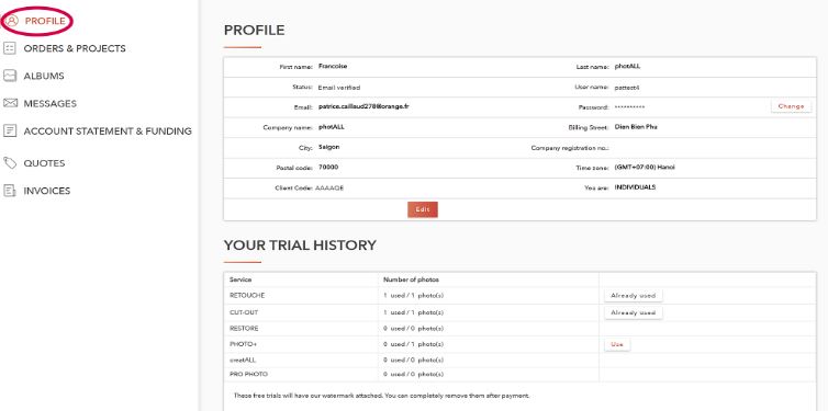 In your "Dashboard" the first page is your "PROFILE". We recommend that you update your information at your convenience. This will allow us to create your invoices with the right address and better arrange delivery service if we know your time zone.
