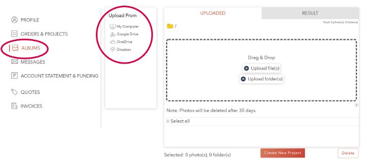 - in "ALBUMS": you can upload all your photos when you have time, you can drag and drop folders and subfolders. When you want to create a Project, you can use photos from your ALBUMS. It is faster than to upload them from your PC.