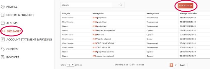 - in "MESSAGES": you can contact us by clicking on "New Message", you can also see the history of all your messages: