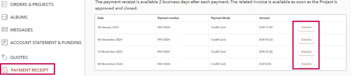 - in "PAYMENT RECEIPT": you will find all the details for each payment. By clicking on "Detail" you will have access to the invoices of the Projects related to this payment: