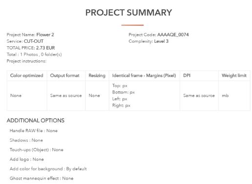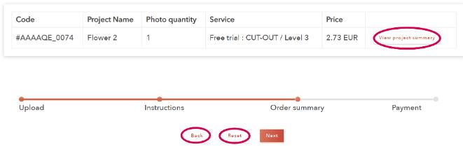 After clicking on "Next", you have access to your "Project summary". If you forgot something, click on "Back" and choose more options. Click on "Reset" if you want to cancel your project: