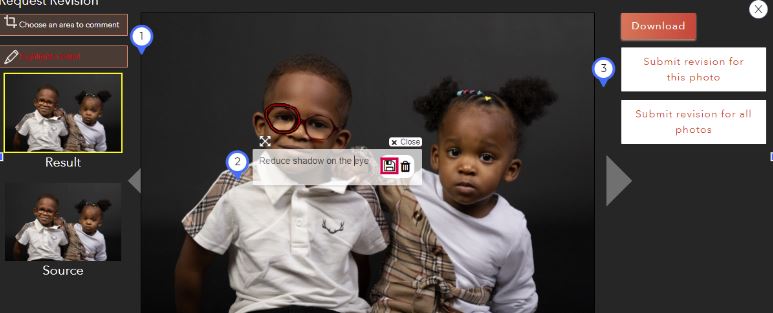 2 - Select the area to be retouched and leave a comment in the dedicated box. Don't forget to save it by clicking on the icon on the right.
