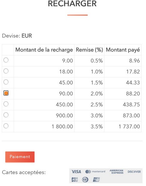 En créditant votre compte, vous bénéficiez de réductions suivant ce barème :