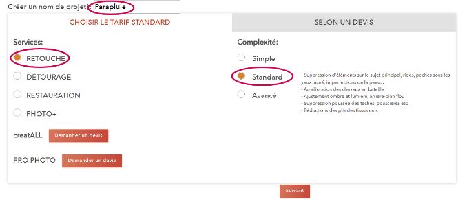 Ensuite cliquez sur "Suivant" pour ouvrir une nouvelle page. Vous pouvez choisir les retouches par défauts, celles-ci sont comprises dans nos prix. N'oubliez pas de nous donner les instructions dans la boite dédiée.