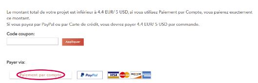Après un dernier clique sur "Suivant", il est temps choisir votre moyen de paiement. Nous vous encourageons à utiliser votre compte. En le créditant vous bénéficiez de remise et il vous est aussi possible de payer de petits montants.
