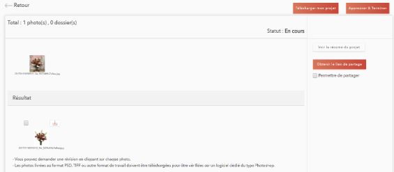 Il est aussi possible de demander une révision, d' "Obtenir le lien de partage" pour partager vos photos avec votre famille, vos amis ou vos clients.