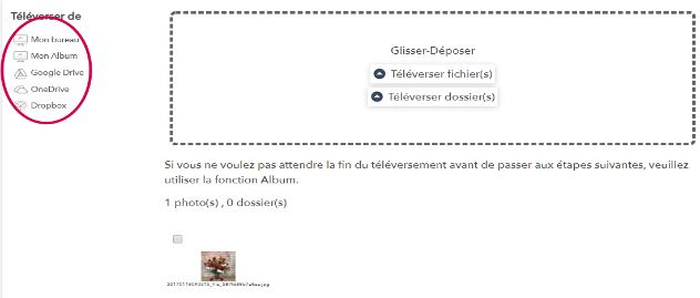 Après avoir cliqué sur "Suivant" téléversez vos photos. Nous vous encourageons à utiliser la fonction "ALBUMS". Vous pouvez y téléverser vos photos quand vous voulez, ensuite au moment de la création de votre Projet,