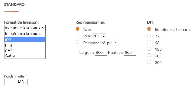 Par défaut le format de sortie, le DPI et la taille de la photo seront identiques à la photo Source, vous pouvez choisir de les modifier :