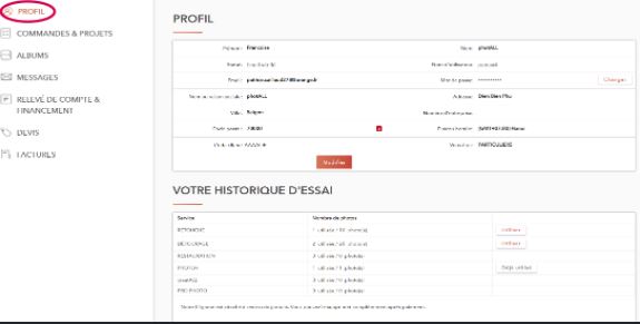 Dans votre "Tableau de bord" la première page est votre "PROFIL". Nous vous recommandons de mettre à jour les informations à votre convenance. Cela nous permettra de créer vos factures avec la bonne adresse et nous pourrons améliorer la livraison des photos si nous connaissons votre fuseau horaire.