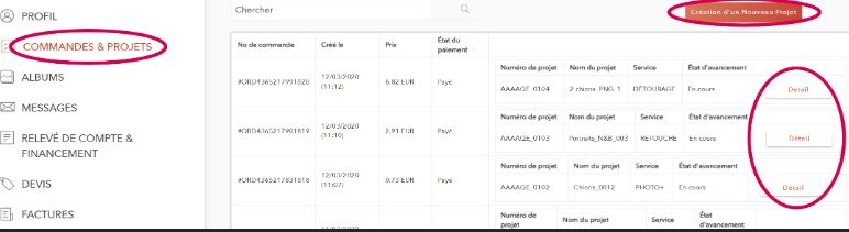 - Dans "COMMANDES & PROJETS" : vous avez accès à l'historique de vos Projets. Vous pouvez aussi créer un nouveau Projet :