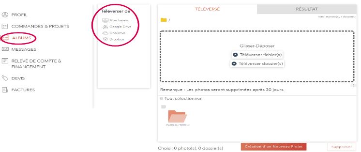 -  Dans "ALBUMS" : vous pouvez téléverser vos photos quand vous avez le temps, vous pouvez glisser-déposer des dossiers et des sous-dossiers. Quand vous voudrez créer un Projet, vous pourrez utiliser les photos de votre ALBUMS. C'est plus rapide que d'avoir à les téléverser de votre PC. Notez que nous ne gardons vos photos que 30 jours :Â