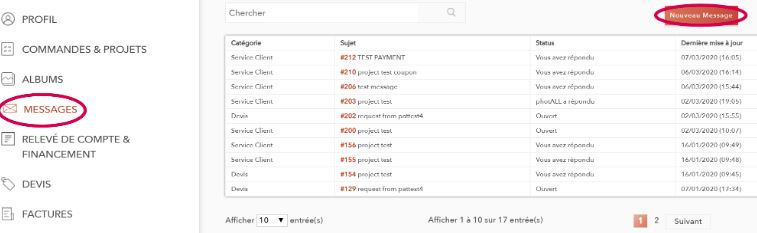- Dans "MESSAGES" : vous pouvez nous contacter en cliquant sur "Nouveau Message", vous avez aussi accès à l'historique de vos messages :  Â