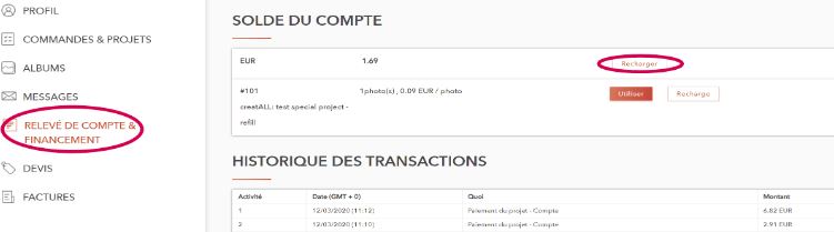- Dans "RELEVÉ DE COMPTE & FINANCEMENT" vous avez accès à l'historique de vos transactions. Vous pouvez aussi créditer votre Compte en cliquant sur "Recharger" et bénéficier de remises :