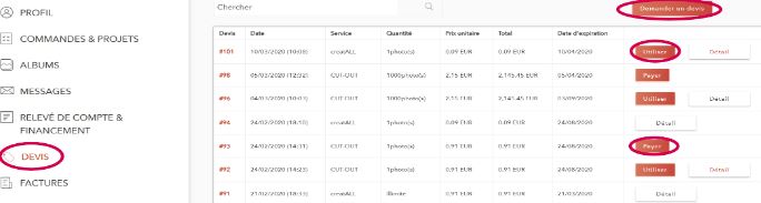 - Dans "DEVIS" : vous pouvez nous demander un devis. Nous vous répondrons le plus tôt possible. Vous pouvez ensuite l'utiliser dès le règlement :