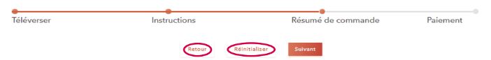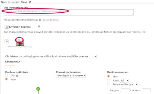 Ensuite cliquez sur "Suivant" pour ouvrir une nouvelle page. Vous y trouverez toutes les options dont vous avez besoin. N'oubliez pas de nous donner vos instructions dans la boite dédiée. Il est aussi possible de laisser un commentaire pour chaque photo en cliquant sur l'icône a coté de chacune d'elles. N'oubliez pas de sauvegarder vos commentaires :