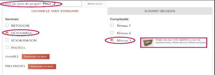 Pour ça, vous devez choisir le Service DÉTOURAGE et le Niveau de Complexité. Pour en savoir plus sur le Niveau de Complexité, nous vous recommandons de lire la page des Services.